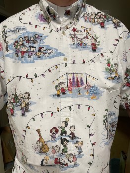 For those who can’t see this, I’m wearing a shirt decorated with scenes from the perennially popular Christmas television special A Charlie Brown Christmas. There are a lot of different images here, from Linus and Charlie Brown out looking for trees, Snoopy’s decorated doghouse, Linus resuscitating the wilted tiny tree near the end, and even the infamous dance party that breaks out at rehearsal. You can tell these are really taken from the special, because that scene includes such later-forgotten characters as Shermy (“I always end up being a shepherd”) and the anonymous twin girls who never show up again, dancing that strange head-flopping-side-to-side dance that must surely have caused concussions.