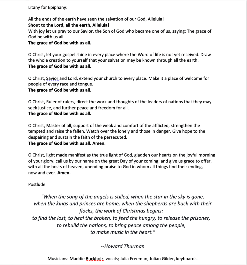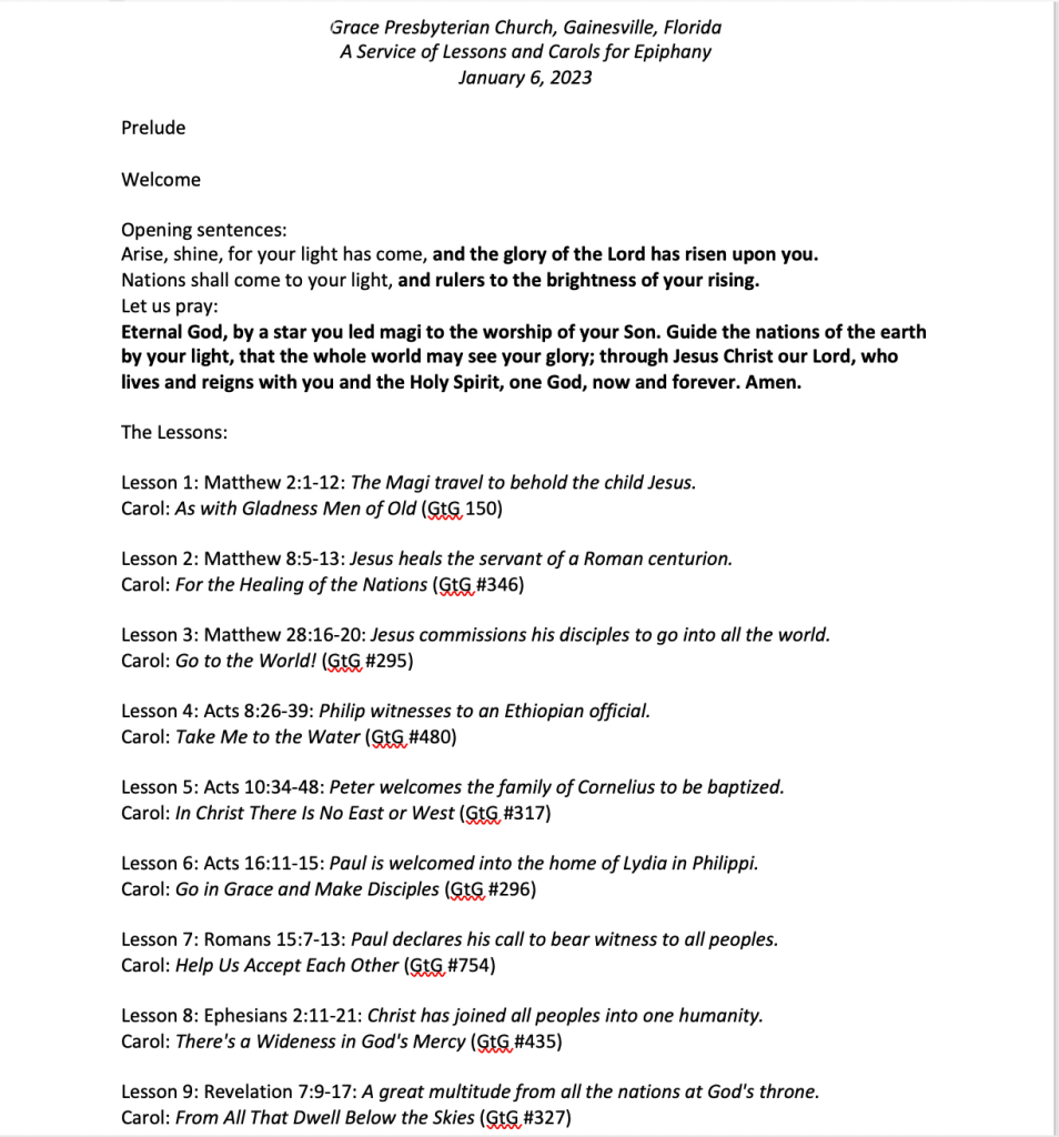 Hymns (from Glory to God: The Presbyterian Hymnal unless otherwise indicated): #12, Immortal, Invisible, God Only Wise; #—, We trust in God, whom Jesus called his father; #17, Sing Praise to God, You Heavens!
